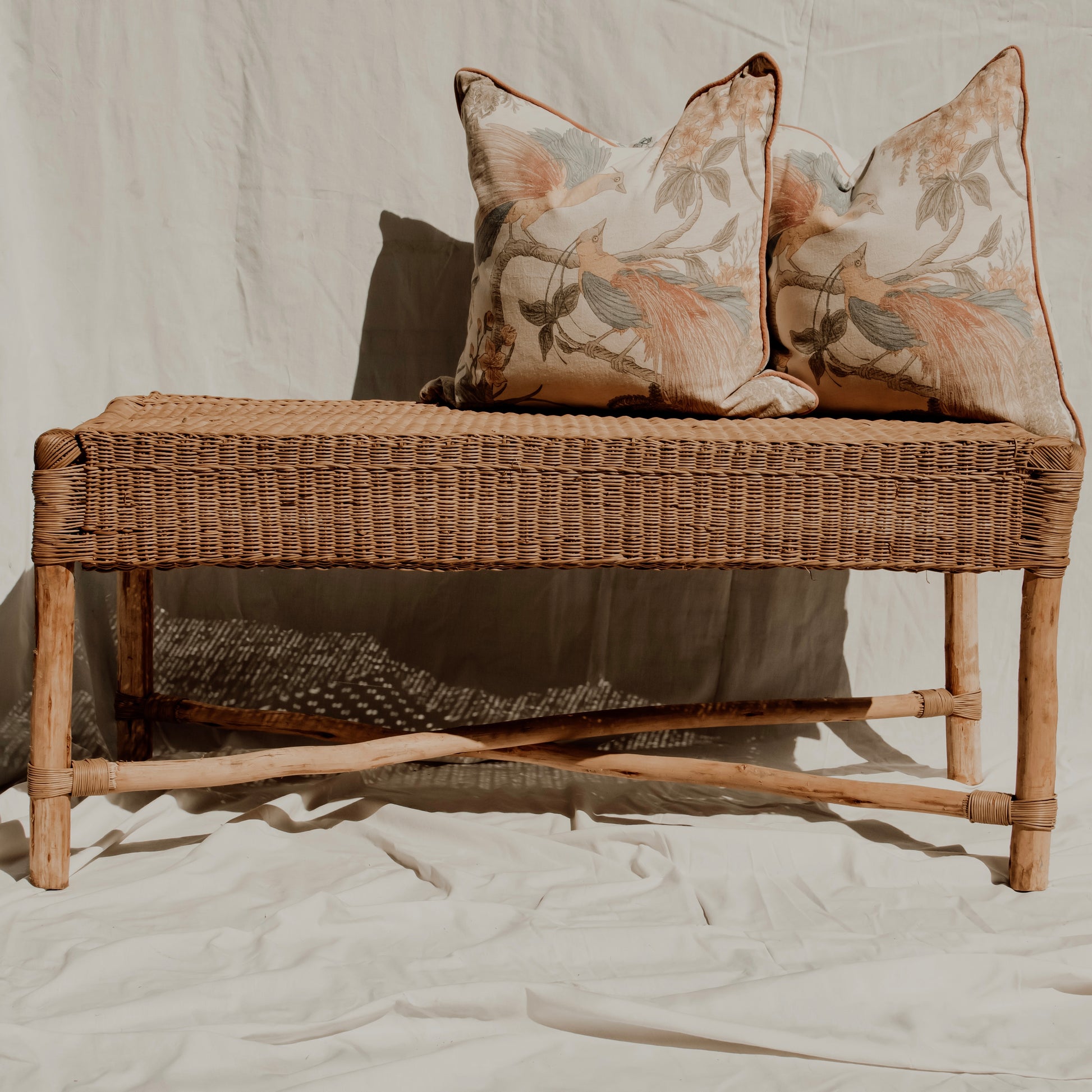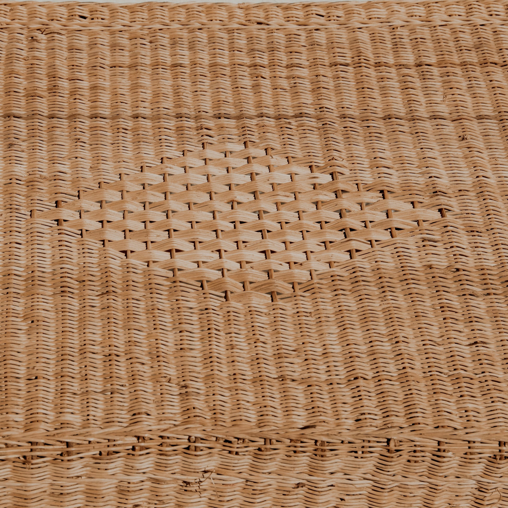 This versatile piece can be used as a table or bench. Crafted from rattan with an intricate weaving pattern on the surface.